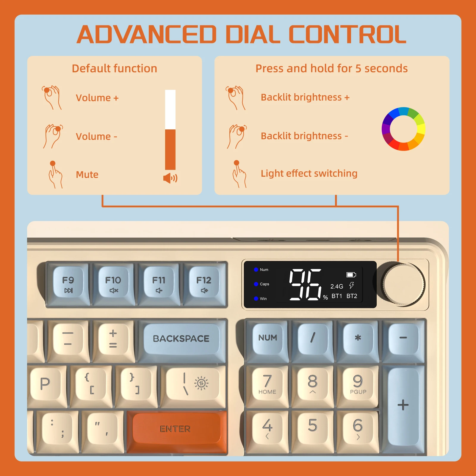 • 【Display Screen & Knob Design & Multimedia Hot Keys】The gaming keyboard built-in LED display screen can intuitively display the keyboard status, including caps lock, connection mode, WIN/MAC, battery. Built-in knobs allow quick adjustment or mute of loudspeaker volume. 12 multimedia keys give you quick access to common functions, improve workflow efficiency.